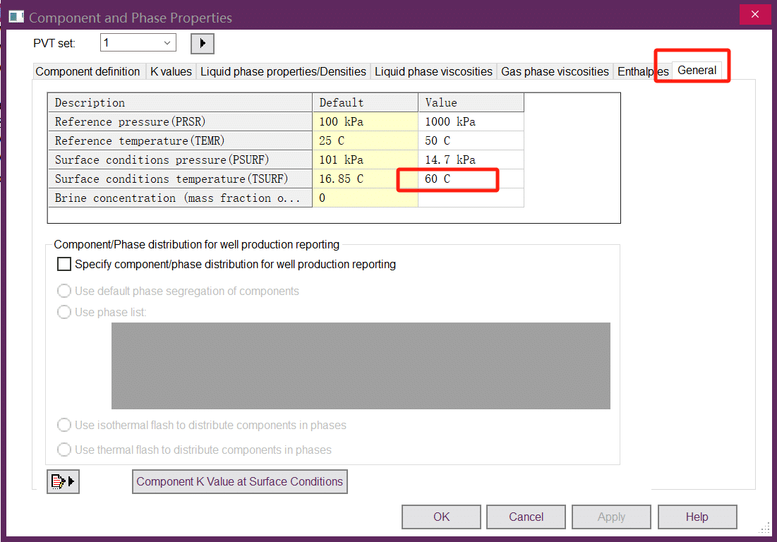 通过OUTSRF well component all可以输出每个相态中组分的含量,可以看到Cumulative gas中100%为Water,说明是相态部分设置的问题,可以检查component部分。如果组分定义没有错,检查最后一个选项卡general,Tsurf设置60C,将影响STG、STL的设置,以及产出量的统计,建议使用常规地面温度和压力。