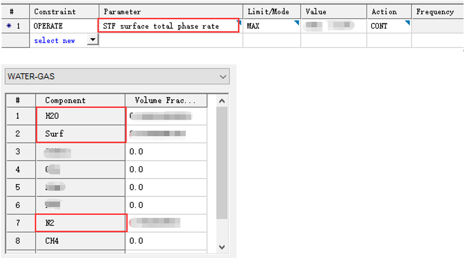 在氮气泡沫模拟时,表活剂含量较低,是以溶液形式注入的,所以一定是有H2O,OPERATE STF MAX定义的值是H2O、Surf和N2的注入体积速度之和,INCOMP定义三个组分的体积分数。加入H2O之后,就能解决表活剂组分注入量的问题。