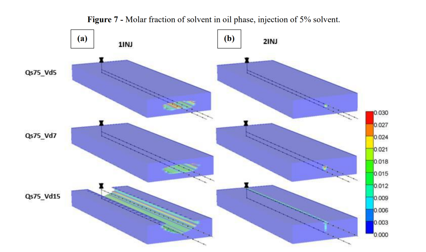 蒸汽-溶剂辅助重力泄油(ES-SAGD)是一种结合了热效应和混相效应的采油方式已在加拿大等重油储层地区成功应用。该方法使用两个平行的水平井,上部井注入蒸汽和溶剂,下部井产出石油。巴西尚未应用此方法,尤其是在东北部地区,那里有重油储层。基于此背景,本研究旨在研究ES-SAGD的应用,这些储层具有与巴西东北部相似的特征,特别是分析溶剂注入方案对ES-SAGD的影响。使用CMG商业软件进行数值模拟,分析了多种蒸汽-溶剂注入速度,并采用了两种溶剂注入温度(储层温度或蒸汽温度),以将由于高温引起的爆炸风险降到最低。结果表明,溶剂注入温度对石油开采有重大影响,注入热溶剂更有利于石油生产,因为冷溶剂会导致蒸汽冷却。然而,也可以注入冷溶剂(储层温度),并通过改变一些蒸汽属性来增加石油生产,避免爆炸风险。