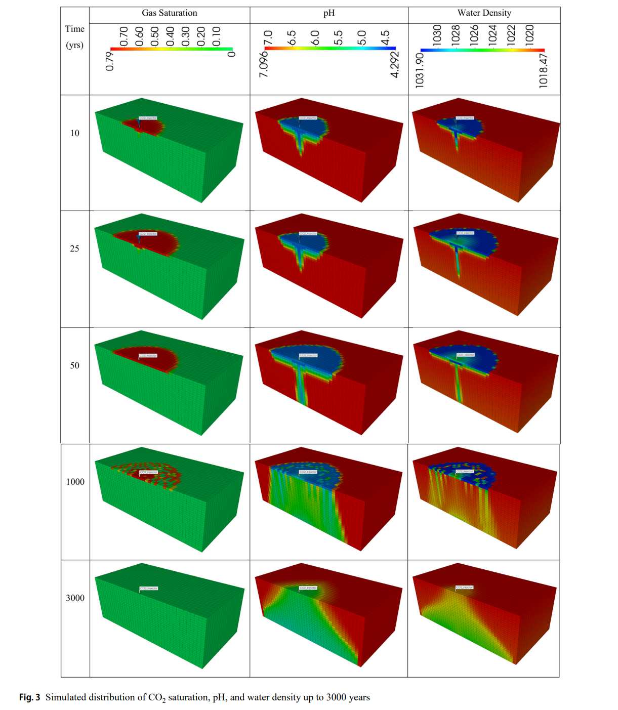- pH最低值4.29出现在注入区,随时间逐渐回升(3000年后达5.3)。