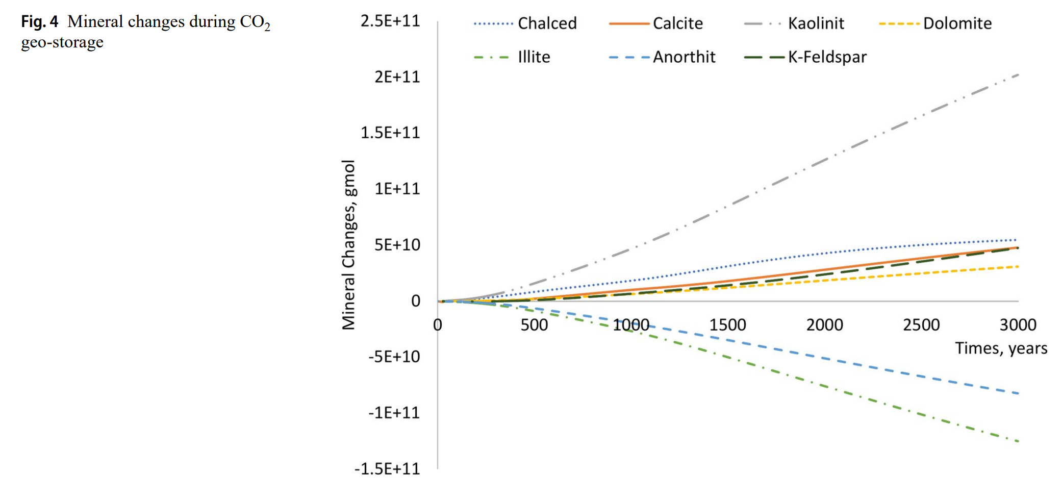 Deep saline aquifers offer a vast long-term storage capacity for CO2. The diverse mineral compositions in CO2 geological storage systems complicate the reactive transport of CO2. Despite extensive research on carbon sequestration in saline aquifers, the impact of rock mineralogy on the CO2 trapping mechanisms needs further investigation. This study addresses this gap by employing numerical simulations to investigate how different minerals affect the reactive transport of CO2 during injection into saline aquifers. A compositional simulation model was created, wherein CO2 is injected for 25 years, followed by a 3000-year shut-in period. Various parameters, including CO2 plume migration, changes in pH, water density variations, mineral dissolution and precipitation, and porosity changes in the reservoir rock, are examined to understand the complex CO2–brine–rock interactions. The effect of formation mineralogy on CO2 trapping mechanisms was investigated. To do so, a sensitivity study was conducted and then, special cases with extreme mineral concentrations were studied. The simulation results highlight the profound effects of different minerals on the CO2 trapping mechanisms. Quartz exhibits minimal dissolution, while calcite plays a crucial role, initially dissolving due to low pH and later precipitating after around 300 years. Anorthite dissolution provides ions for kaolinite precipitation, and the release of calcium ions from anorthite dissolution contributes to carbonate minerals precipitation. Porosity changes in the reservoir rock are observed, with regions experiencing an increase due to early calcite dissolution and subsequent changes associated with mineral precipitation. Sensitivity analysis showed that Anorthite and Illite facilitate more CO2 mineralization, with Anorthite and Illite showing 0.68 and 0.46 correlation with mineral trapping, respectively. Conversely, minerals like Calcite and Kaolinite positively correlated with CO2 solubility, with correlations of + 0.21 and + 0.23 respectively, without significantly promoting its conversion into mineral forms, while Quartz, K-Feldspar, and Dolomite show minor effects on CO2 trapping mechanisms. Elevating Anorthite concentrations speeds up CO2 mineralization, ensuring secure storage in saline aquifers, with a minimum threshold concentration of 0.05 volume fraction; beyond this point, no further changes in CO2 mineralization are observed. Formation brine salinity significantly affects CO2 solubility and, consequently, mineral trapping, as higher salinity levels hinder CO2 dissolution and restrict its availability for geochemical reactions with rock minerals. This study offers insights that can inform reservoir characterization and management practices, ultimately enhancing the effectiveness of carbon sequestration efforts.