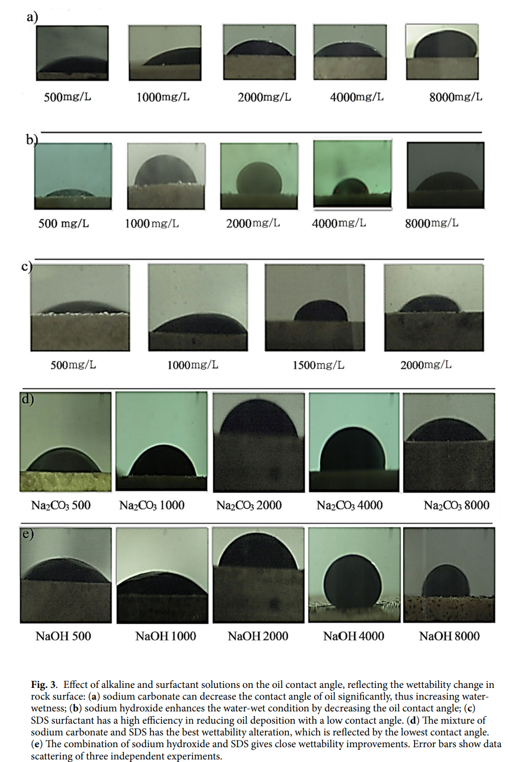 在碳酸盐岩储层中,通过强碱在酸性油存在下水解产生阴离子表面活性剂,以防止表面活性剂值下降。同时,研究了碱性表面活性剂在三种碳酸盐岩中的界面张力降低机理以及润湿性变化。结果表明,通过增加两种碱(氢氧化钠和碳酸钠)的浓度,储层岩石的润湿性发生了变化。进一步提高碳酸钠浓度可使储层岩石的润湿性变为中性。将氢氧化钠浓度增加到2000 mg/L,可使储层岩石的润湿性从油湿变为水湿,从而通过使用最佳浓度的碱性表面活性剂在岩心驱替实验中提高采收率。通过岩心驱替模拟,利用钠氢氧化物和碳酸钠的碱性表面活性剂驱替,通过生产数据的历史拟合进行预测。