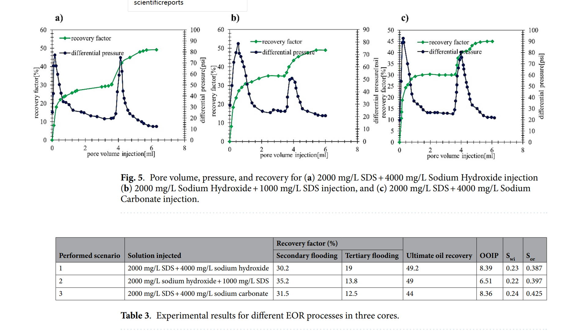 在实验过程中,作者使用了CMG STARS模拟器(版本2023.1)来模拟水和碱性表面活性剂驱替过程。模拟模型是水平构建的,包含两个垂直井(生产井和注入井),与实验设置一致。通过模拟,作者对实验结果进行了历史拟合,确定了水和油的相对渗透率的指数值,分别为3.8和2.1。模拟结果与实验结果吻合良好,验证了模拟的准确性。此外,模拟还用于研究不同注入方案在网格(10,3,2)中的界面张力变化情况,结果表明,2000 mg/L SDS + 4000 mg/L氢氧化钠方案在降低界面张力方面最为有效,这与实验中观察到的采收率提高结果一致。