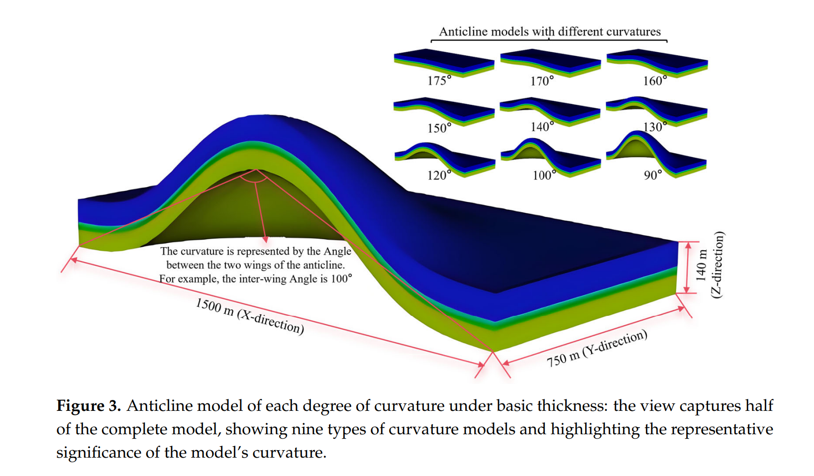 选址评估是盐穴储氢研究中的关键步骤,储层几何特征是决定选址评估的关键因素之一。然而,对于具有有效圈闭能力的背斜盐穴储层,储层曲率、厚度和井配置对储氢效率的耦合效应尚不清楚。因此,本文基于鄂尔多斯盆地,设计了不同曲率、厚度和井配置的三维计算模型进行模拟分析。