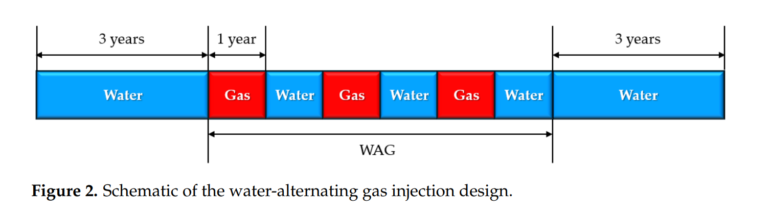 – 52×1×20 二维均质碳酸盐剖面模型(网格 10 ft×10 ft×5 ft),矿物组成:方解石 64 %、白云石 10 %、硬石膏 2 %。 - 全过程 12 年注入:前 3 年 LSW 驱 → 中间 6 年 1:1 LSWAG 交替 → 后 3 年 LSW 驱;共运行 9 组方案(3 种 DME 浓度 × 3 种盐水矿化度)。
