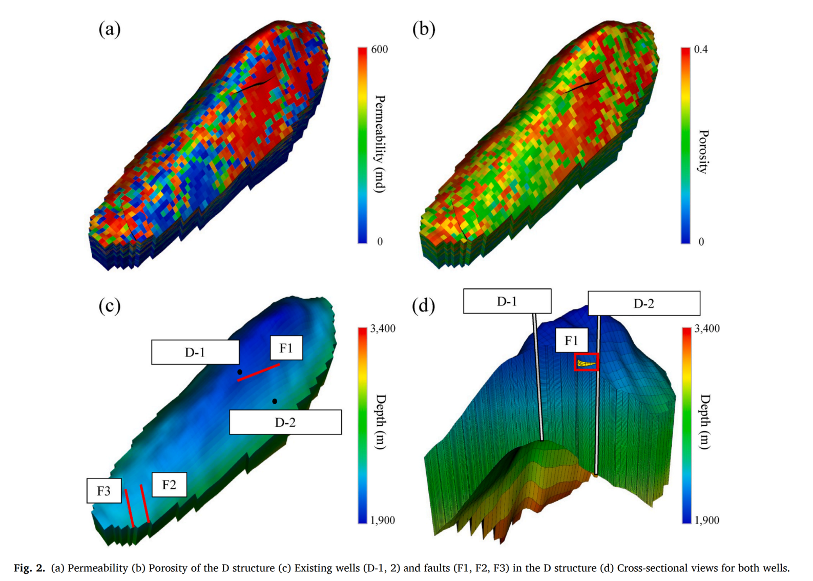 - 地质模型: 基于D构造实际地质数据建立三维模型,包含两口井(D-1、D-2)和三条断层(F1、F2、F3),孔隙度最高0.4,渗透率最高600 mD