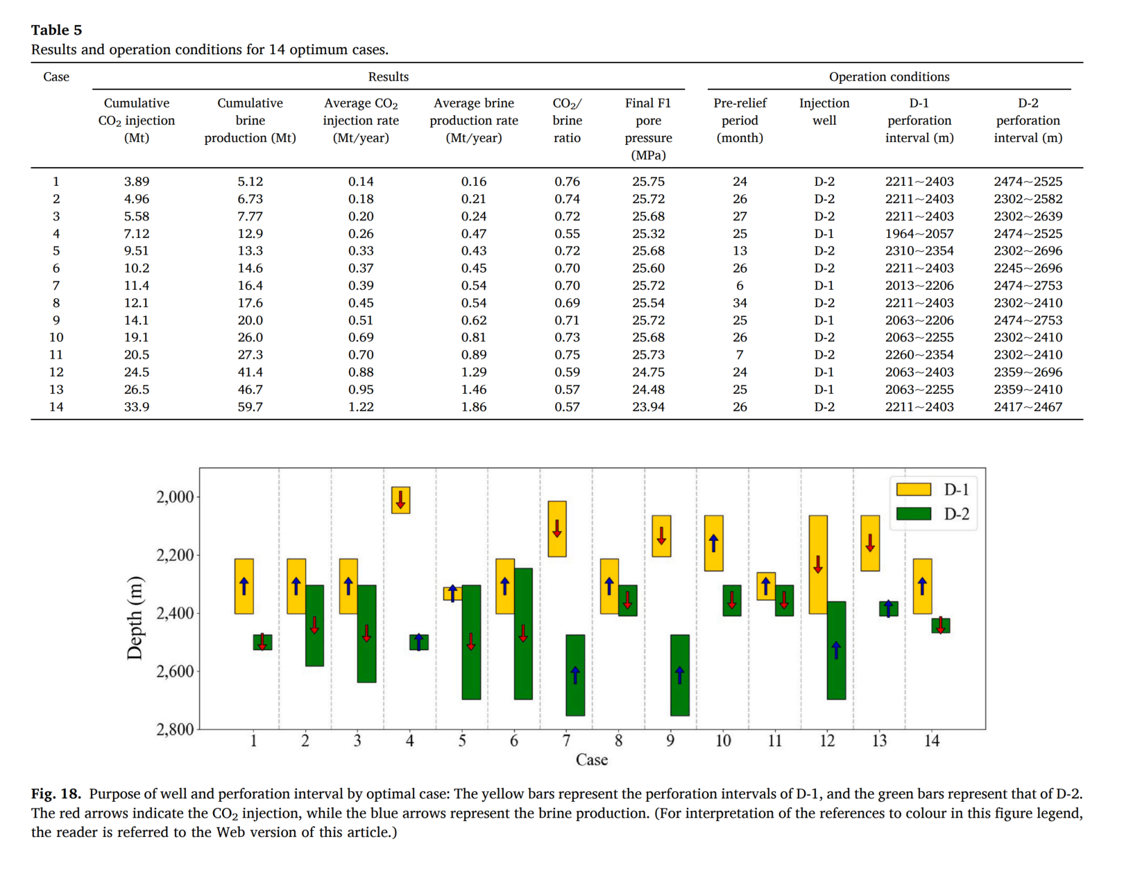 优化目标为最大化累计CO₂注入量和最小化累计卤水产量,考虑的设计参数包括预缓解期(pre-relief period)、井型选择(注入/缓解)及射孔段位置。模型盲测预测精度R²均高于90%。采用NSGA-II算法结合SPM获得14个最优解及帕累托前沿,结果显示最小累计CO₂注入量为3.89 Mt(卤水产量5.12 Mt),最大累计CO₂注入量可达33.9 Mt(卤水产量59.7 Mt)。研究表明,注入井与缓解井的射孔段优化强烈依赖于操作条件和储层特性,必须针对具体地质设置进行优化设计。