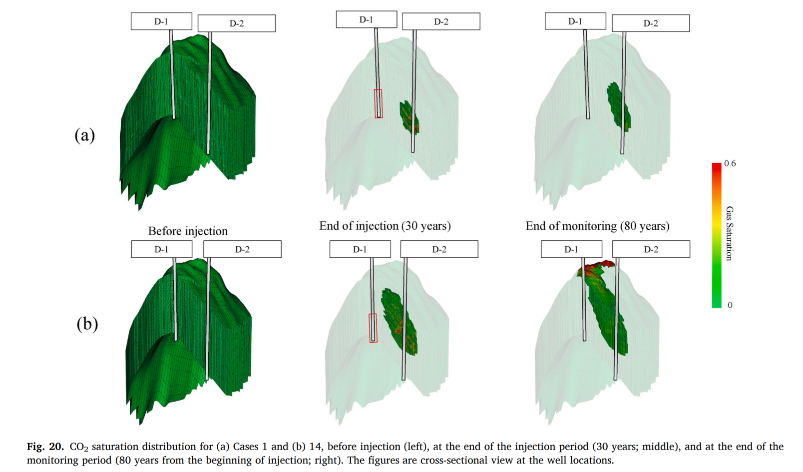 - 地力学稳定性约束: 针对超压含水层D构造,基于最保守假设(内聚力为零、摩擦系数0.6)的地力学分析表明,必须将断层顶部孔隙压力控制在初始值(25.8 MPa)以下,并设置预缓解期降低孔隙压力后方可进行CO₂注入。